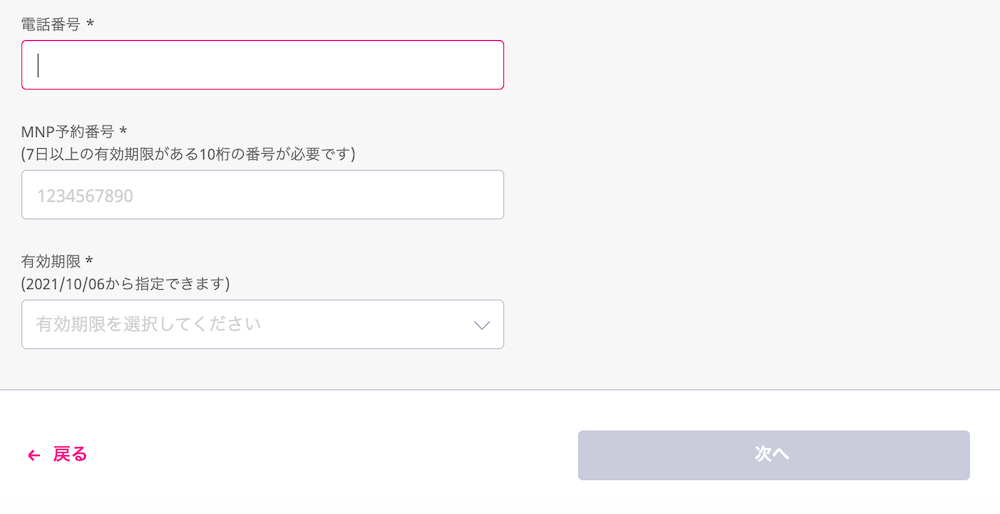 他社からの乗り換え(MNP)の方は電話番行とMNP予約番号を入力します。