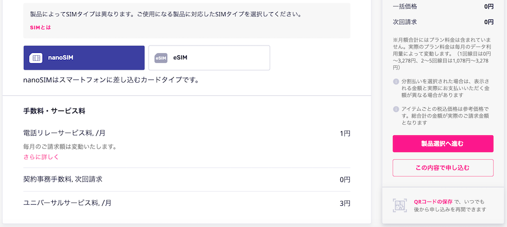 - ・プランとセットで製品も購入する場合はSIMタイプ(nanoSIM / eSIM)をどちらか選んで「製品選択へ進む」をクリックし、次のページで製品を選択して申し込みをする