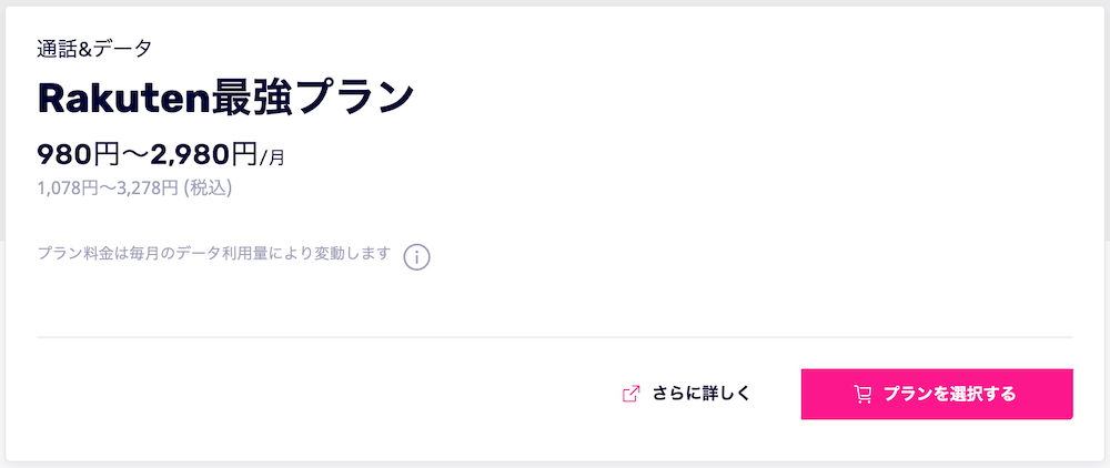 2024年5月現在、楽天モバイルは「Rakuten最強プラン」のワンプランのみとなっており、料金は月額1,078円〜3,278円の変動制となっています。(毎月のデータ利用量により変動します)