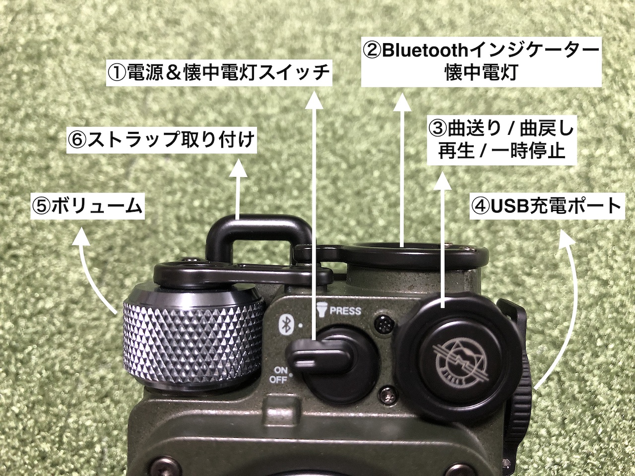 本体上部には「Bluetoothインジケーター / 懐中電灯」があります。