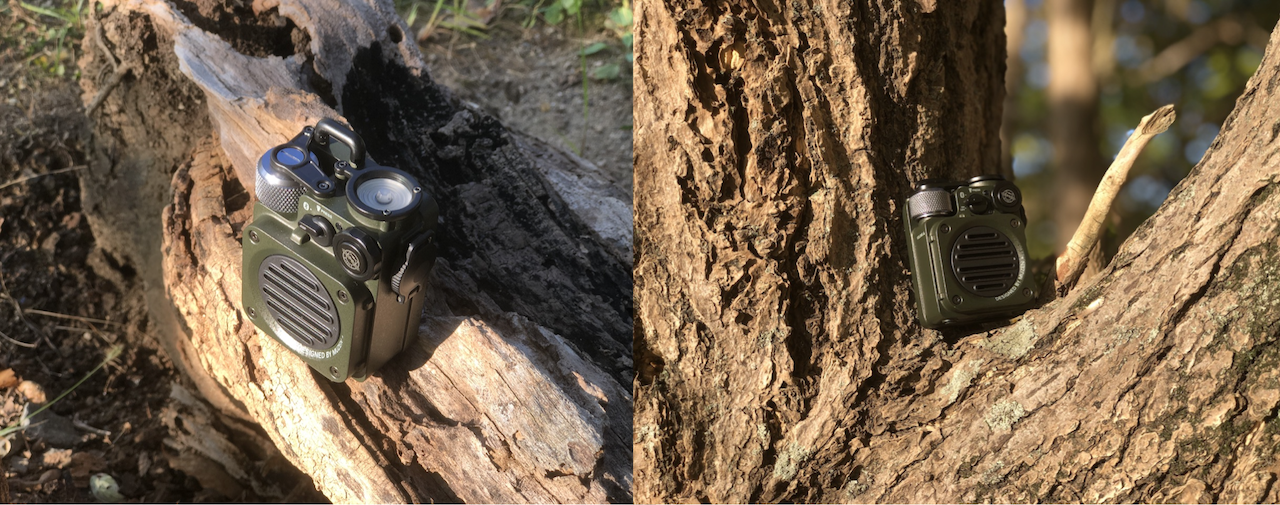 自然の中のどこに置いてもサマになります。デザイン的にも耐水機能的にもアウトドアにうってつけの小型スピーカーです。